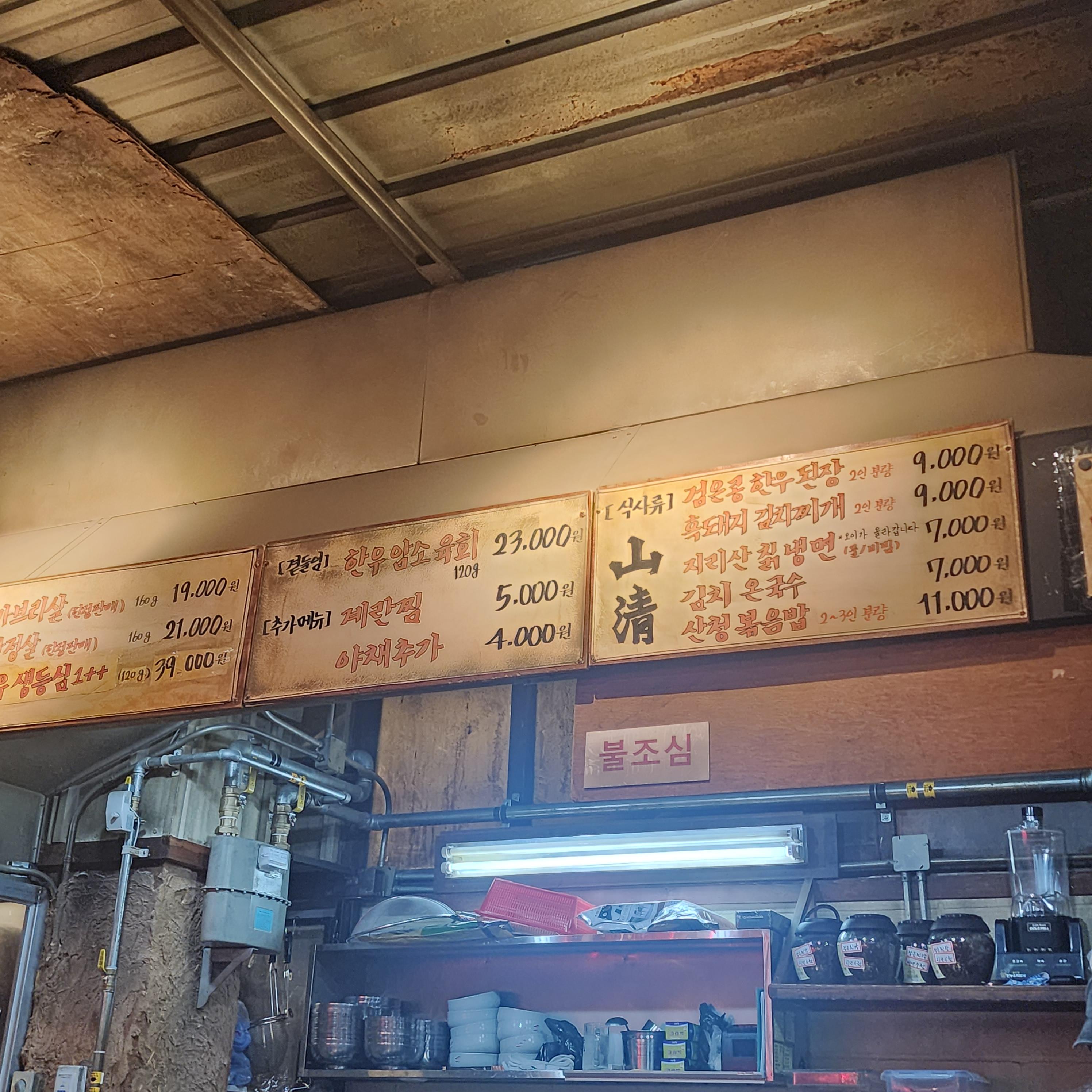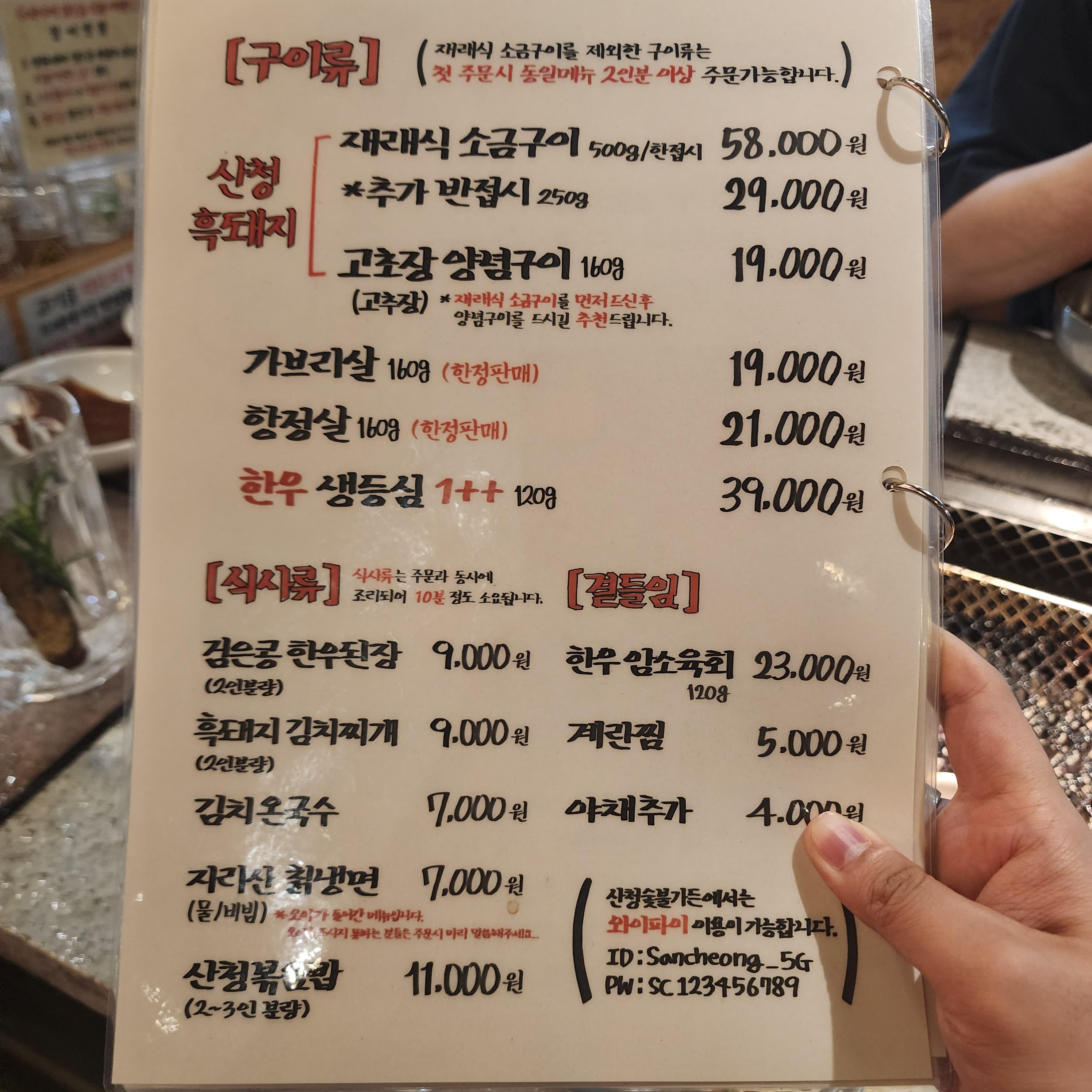 을지로 <산청숯불가든>의 메뉴표입니다! 산청흑돼지 재래식 소금구이와 고초장 양념구이가 대표메뉴이며 가브리살과 항정살, 한우 생등심까지 맛보실 수 있습니다!
